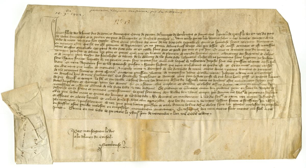 Légende photo : Acte de Jean, comte du Poitou et fils du roi de France, permettant d’imposer une somme sur les habitants de Niort, 18 novembre 1402 (AD79, E DEPOT 23/13)