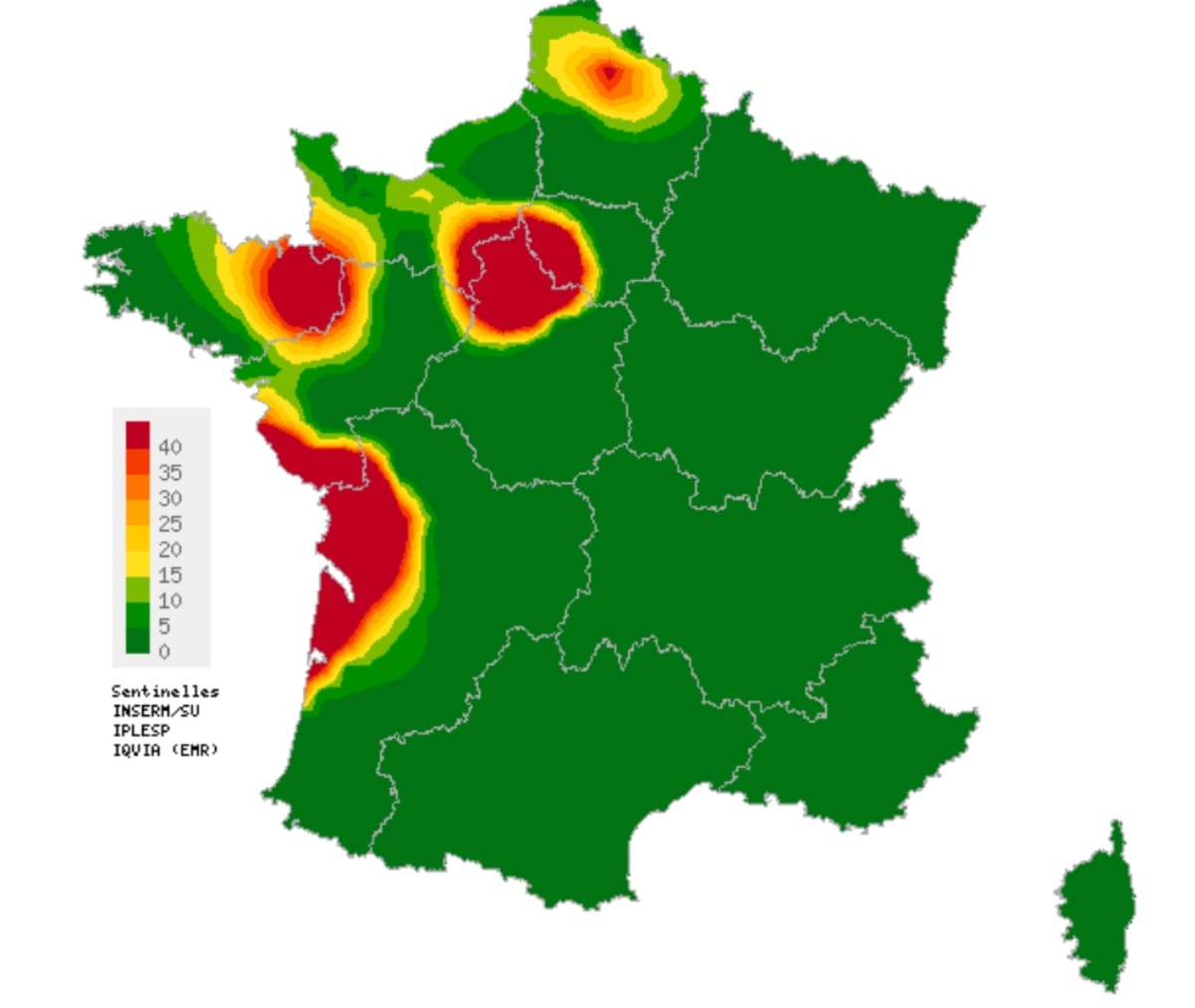 A une exception près : la varicelle. Elle est plutôt présente dans l’ouest des Deux-Sèvres, le sud Vendée, le nord de la Gironde et et la Charente-Maritime avec plus de 40 cas diagnostiqués pour 100 000 habitants.
