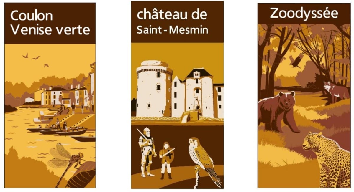 Installés le long des autoroutes A87 (Maine-et-Loire et Vendée), A83 et A10 qui traversent le département, ces panneaux d’animation « constituent autant d’invitations à découvrir certains des trésors qui composent le patrimoine culturel français. Parmi les nouvelles réalisations sont ainsi mis en avant le village de caractère de Coulon, véritable vecteur touristique, et le site de Zoodyssée, un des sites les plus visités du département. »