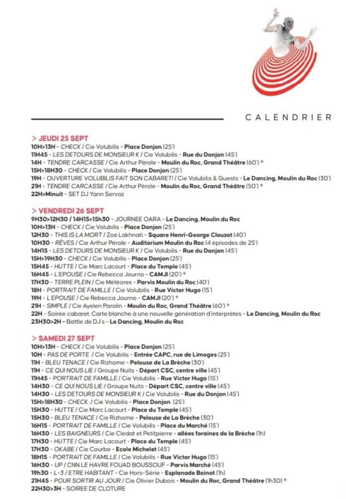 Sur trois jours fin septembre, avec ses 23 événements dont 18 spectacles (cinq créations), le festival veut « continue de faire rayonner une vision chorégraphique singulière, à la fois poétique et politique », expliquent ses organisateurs. « On le ressent plus que jamais dans les choix de cette édition, qui place la jeunesse au cœur de la scène – à la fois comme sujet et comme partenaire. Avec Check, nouvelle création participative de Volubilis et Tendre Carcasse d’Arthur Pérole, la jeunesse s’invite en scène avec ses tensions, ses cris muets, ses élans. Sans oublier la très attendue HUTTE, nouvelle création de Marc Lacourt. »