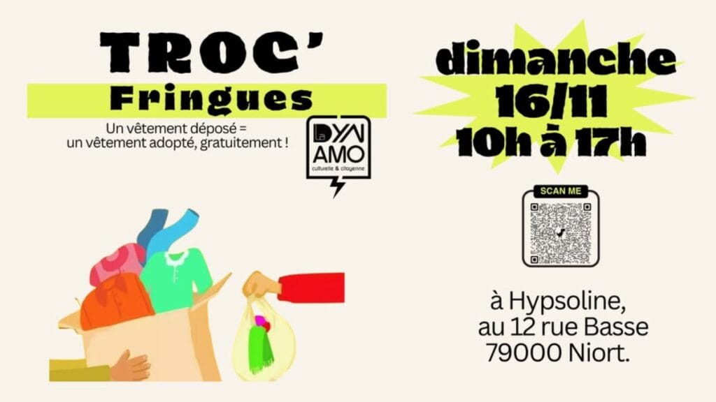 L’Association La Dynamo organise un trocfringues dimanche 16 novembre, de 10h à 17h, à l’Hypsoline Kitchen – 12 rue Basse, à Niort
